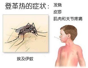 登革热潜伏期5~8天,前驱症有鼻炎、结膜炎,突然高热、恶寒、头痛、眼眶后痛、肌炎、剧烈性头痛、肌痛、关节痛、恶心、呕吐、乏力、厌食,第1次发热可达39~40℃。持续4~5天下降,症状减轻约1~3天后再次出现高热(双峰热),在发病3~5天,多数病人首先在躯干两侧出现麻疹样红斑,逐渐向四肢发展,以前臂屈侧为多,呈猩红热样皮疹,向颜面、四肢扩展。有的病例在手足、掌跖、踝及小腿可见紫癜样斑丘疹,伴瘙痒,消退后有脱屑。